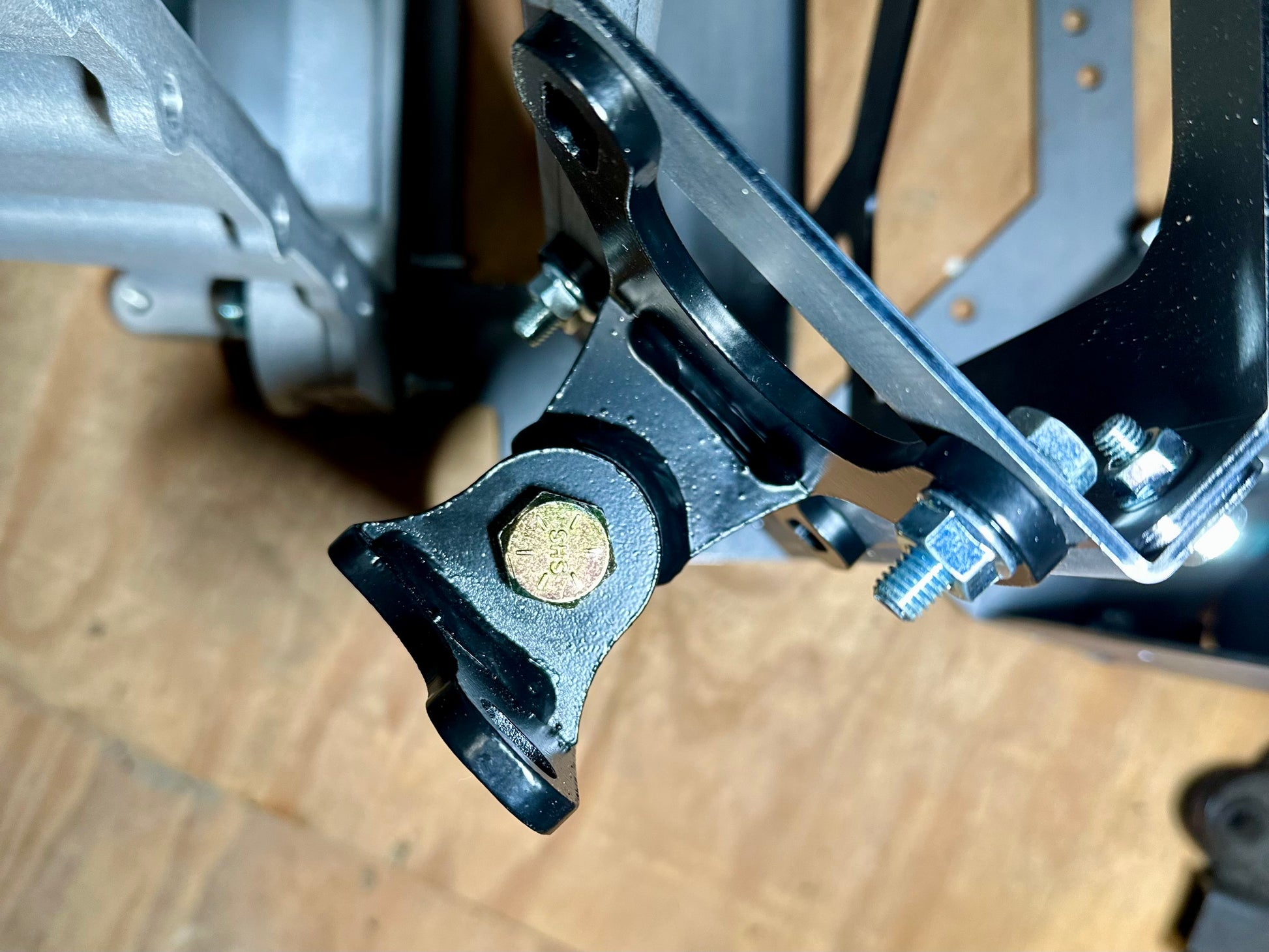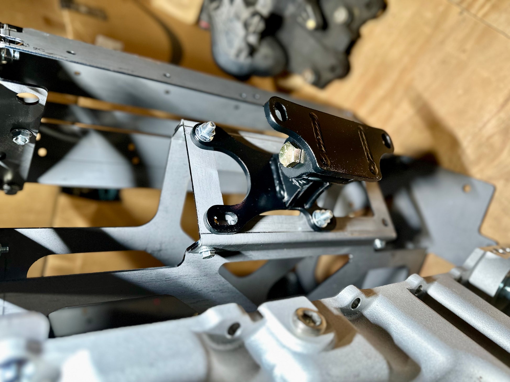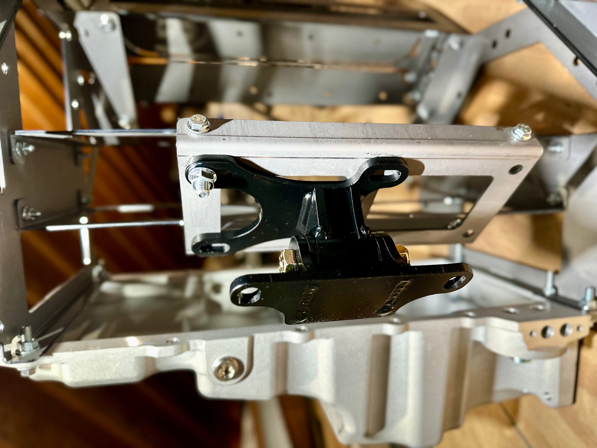 Two pairs of fabricated mounts. These bolt directly to LS engines and allow the engine to be mounted directly to the OEM Nissan frame using stock hardware. Factory 2” offset to align with stock trans tunnel. Note, for driver’s side use center and back holes on block, for passenger side use center and front holes.